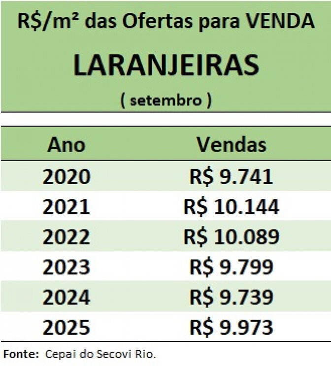 Os dados mostram que, após quatro anos de queda ou estabilidade, o metro quadrado em Laranjeiras voltou a subir em 2025, o que sinaliza confiança e nova valorização na região.