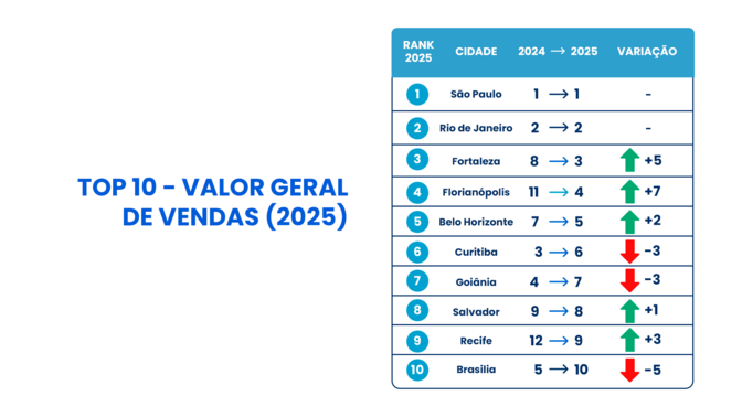 Já Fortaleza e Florianópolis se destacaram pelo avanço expressivo no ranking. O estudo indica que a capital cearense alcançou VGV de R$ 4,9 bilhões em 2025, alta de 41% ante 2024, subindo cinco posições. Já Florianópolis avançou sete posições, com VGV de R$ 4,6 bilhões em vendas, crescimento de 91% em 2025. Confira as tabelas: