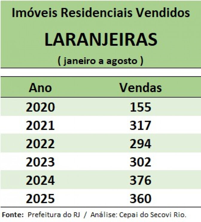 Segundo Maurício Eiras, coordenador do Cepai (Centro de Pesquisa e Análise da Informação) do Secovi Rio, o estudo foi feito com base nos dados do ITBI (Imposto sobre Transmissão de Bens Imóveis), calculado pela Prefeitura do Rio. Para ele, as informações apontam para uma retomada consistente nas vendas residenciais em Laranjeiras e um movimento de valorização da região.