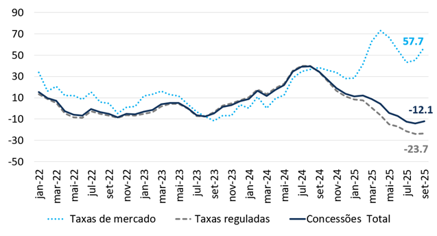 No âmbito do Sistema Financeiro Nacional, a carteira de crédito imobiliário cresceu +8,6% nos primeiros 9 meses de 2025, abaixo do crescimento de +9,4% no mesmo período do ano anterior. Essa expansão resultou de um crescimento maior das operações com taxas de juros de mercado, relativamente àquelas com taxas reguladas, o que compensou parcialmente a maior proporção (cerca de 90%) do saldo das operações com taxas reguladas[1]. Ainda que a imensa parte do mercado de crédito imobiliário esteja ligada a taxa reguladas (em saldos ou em concessões), destaca-se que, recentemente, aumentou o crescimento das concessões a taxas de mercado.