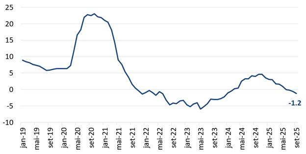 A caderneta de poupança, principal fonte de recursos para os financiamentos imobiliários, tem apresentado declínio em seus saldos, levando a restrições na oferta de financiamentos habitacionais. O saldo das cadernetas de poupança junto ao SBPE tem flutuado em torno de R$750,0 bilhões desde outubro de 2022 (gráfico 1). Após crescer em termos interanuais entre novembro 2024 e abril 2025, a expansão tem declinado, com recuo de 1,2p.p. em setembro. Ao mesmo tempo, as instituições financeiras têm captado recursos por meio de outros instrumentos, como as como as Letras de Crédito Imobiliário (LCI) e Letras Imobiliárias Garantidas (LIG), que são utilizadas como lastro de operações imobiliárias. Note-se que embora os recursos do Fundo de Garantia de Tempo de Serviço (FGTS) também sejam utilizados em operações dessa natureza, há condições específicas para a sua utilização[2].