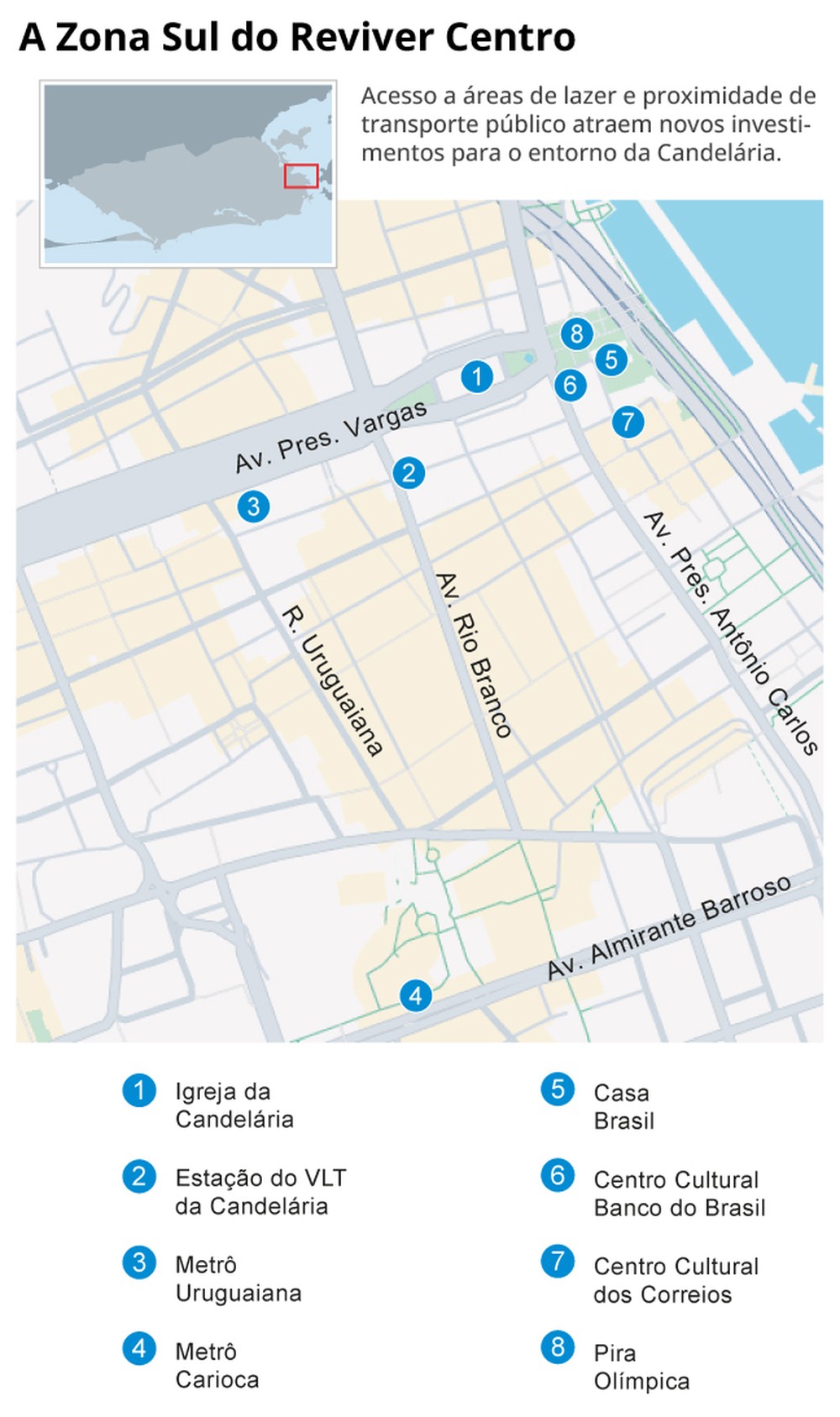 Por sua vez, o Serviço Social do Comércio (Sesc) adquiriu três prédios também na região. Um deles é o Vista Olímpica, também na Avenida Presidente Vargas, na altura da praça onde fica a pira olímpica. No edifício, funciona desde 2024 o Cápsula, centro de inovação voltado para a formação de mão de obra da indústria criativa. Os outros imóveis ficam na Praça Pio X: um foi a sede do Banco Safra e outro abrigou um campus da Universidade Candido Mendes.